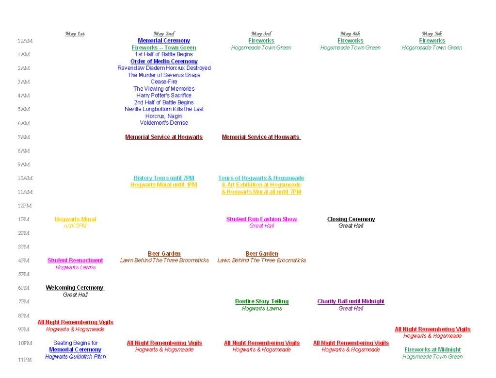 Recall fond memories at the Storytelling Bonfire held on Hogwarts Lawn, raise your glasses to everyone who fought for our freedom behind The Three Broomsticks, walk in the footsteps of our heroes during the Tours through Hogsmeade & Hogwarts, and experience the night itself through the Student-Run Reenactment and special Memorial Ceremony. All are allowed to enjoy the Vigils and Fireworks at Midnight every day of the holiday, and dance the night away at the Charity Ball (proceeds will go to St. Mungo's and the Fund for the Families of the Fallen).