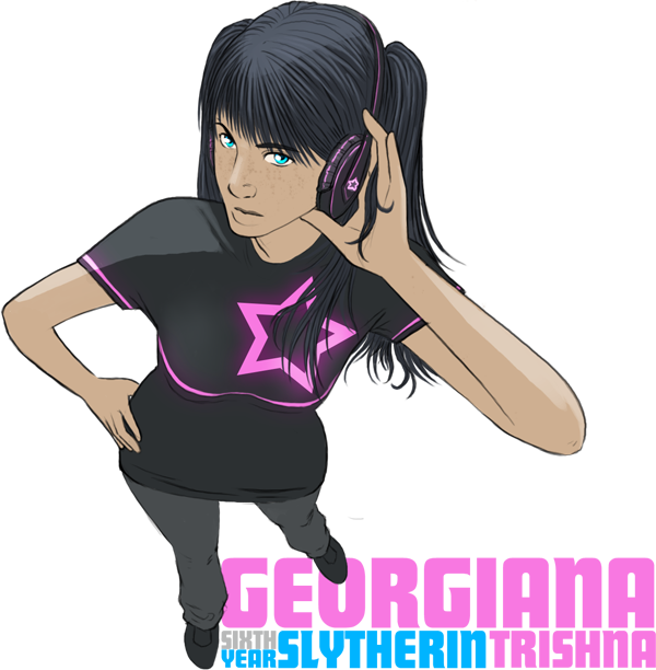 Her hair, when worn in a more mundane fashion, is black, thick, and quite long. Her bangs are cut straight across her forehead, and the rest of her hair falls to her waist. When she can get away with it (in other words, while not at school), or really wishes to irritate her brother, Georgiana tends to do her hair in more of a cybergoth-inspired style. This usually involves brightly colored hair extensions either in Slytherin colors, or in a cyan shade similar to that of her eyes, though occasionally she'll dye portions of her own hair as well.