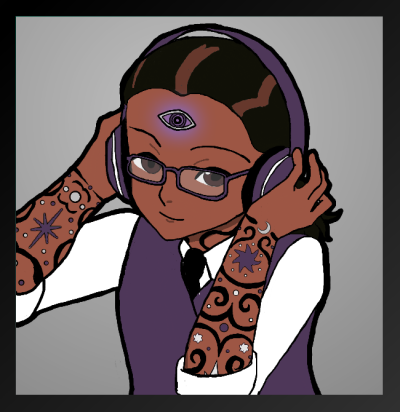 In person, Silas would be plain if it weren’t for the fact that the entirety of both arms as well as most of his back and neck are covered in charmed tattoos. The black sections, which dominate designs in vaguely tribal-esque swirls, tend to move like tendrils, while the fixed, colored stars and astrological signs occasionally flash, change color, or turn in place. Most intriguing of all is the “third eye” in the middle of his forehead, which is usually “closed” – appearing as only a thin black line – but “opens” and begins to glow when he’s broadcasting or divining. Said eye doesn’t actually add anything to either practice. Silas just likes the added dramatic touch.