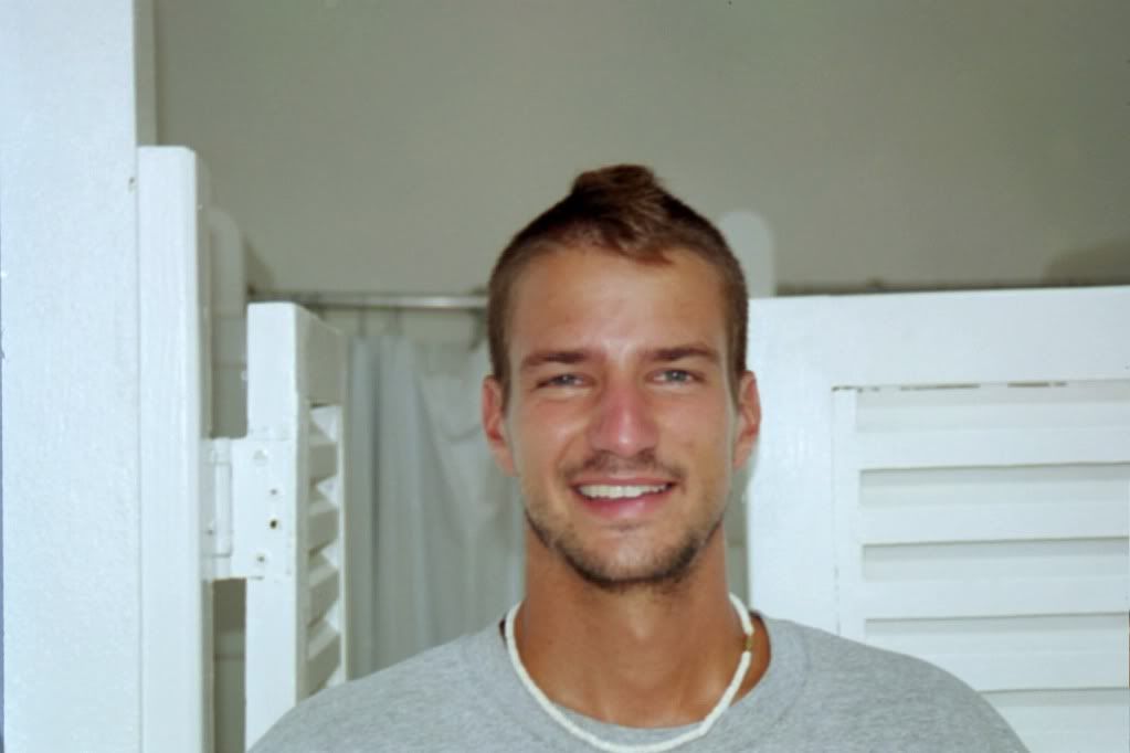 Mohawk as part of a bet from his cousins (he won) much to his mother's horror. His hair is starting to grow back so he has buzz cut length hair on the sides making the ridge of hair stand out less. He only gelled it up in spikes once, for the bet, and has refused to do so since then, finding the stiffness of his hair impeding his nervous habit of running his fingers through his hair. His eyes are a bright cornflower blue and combined with his dark hair and skin they stand out significantly.